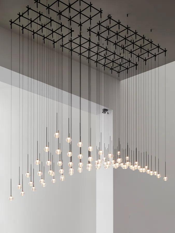 This series blends beauty and geometry into a lighting system filled with a sense of magic. Algorithm Grid combines geometric precision with sensory delicacy. The collection features configurations of glass spheres, suspended at varying heights and anchored to the ceiling by a floating tubular structure. In its Grid version, the mouth-blown glass spheres align in a perfect grid, creating a rhythmic composition that brings structure without compromising lightness. Ideal for projects requiring formal coherence and a warm atmosphere, it is a luminaire that transforms order into visual poetry.