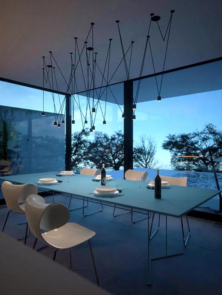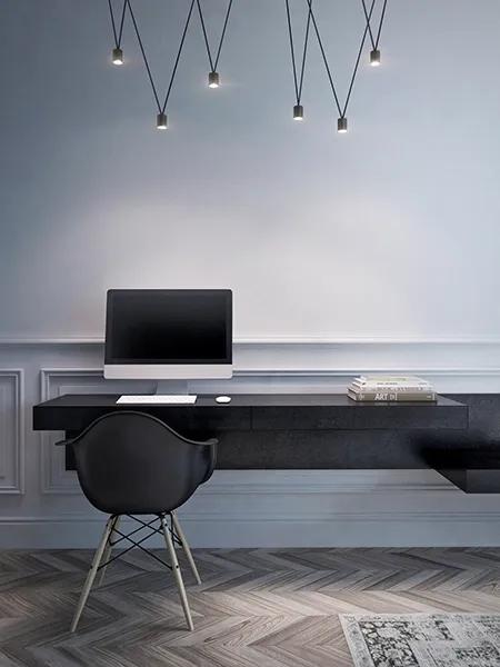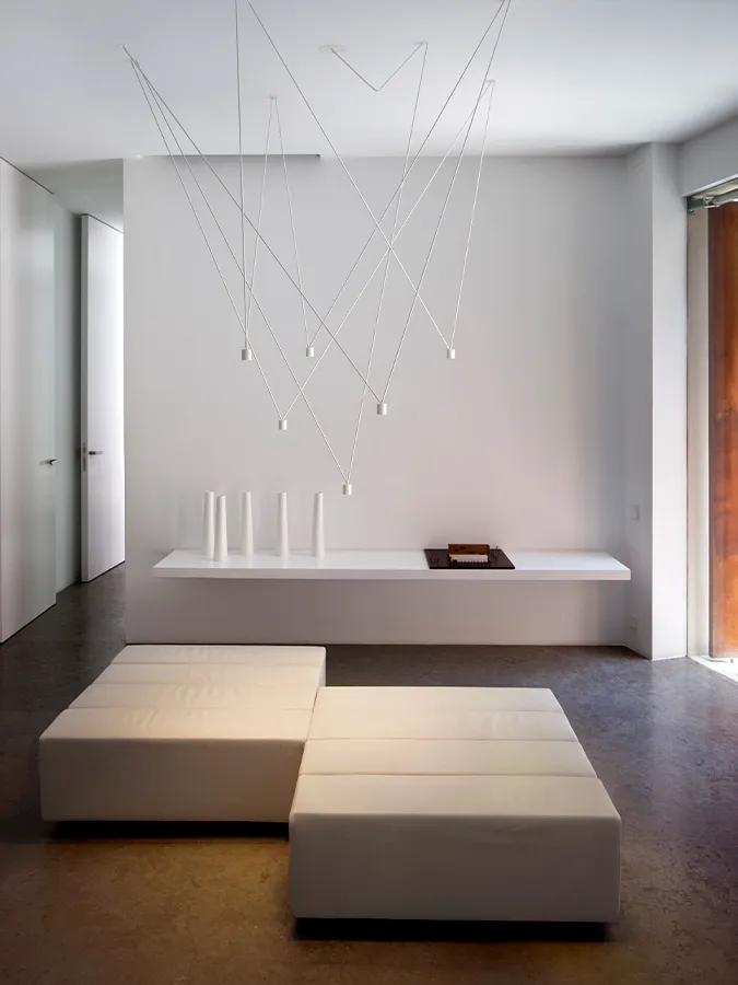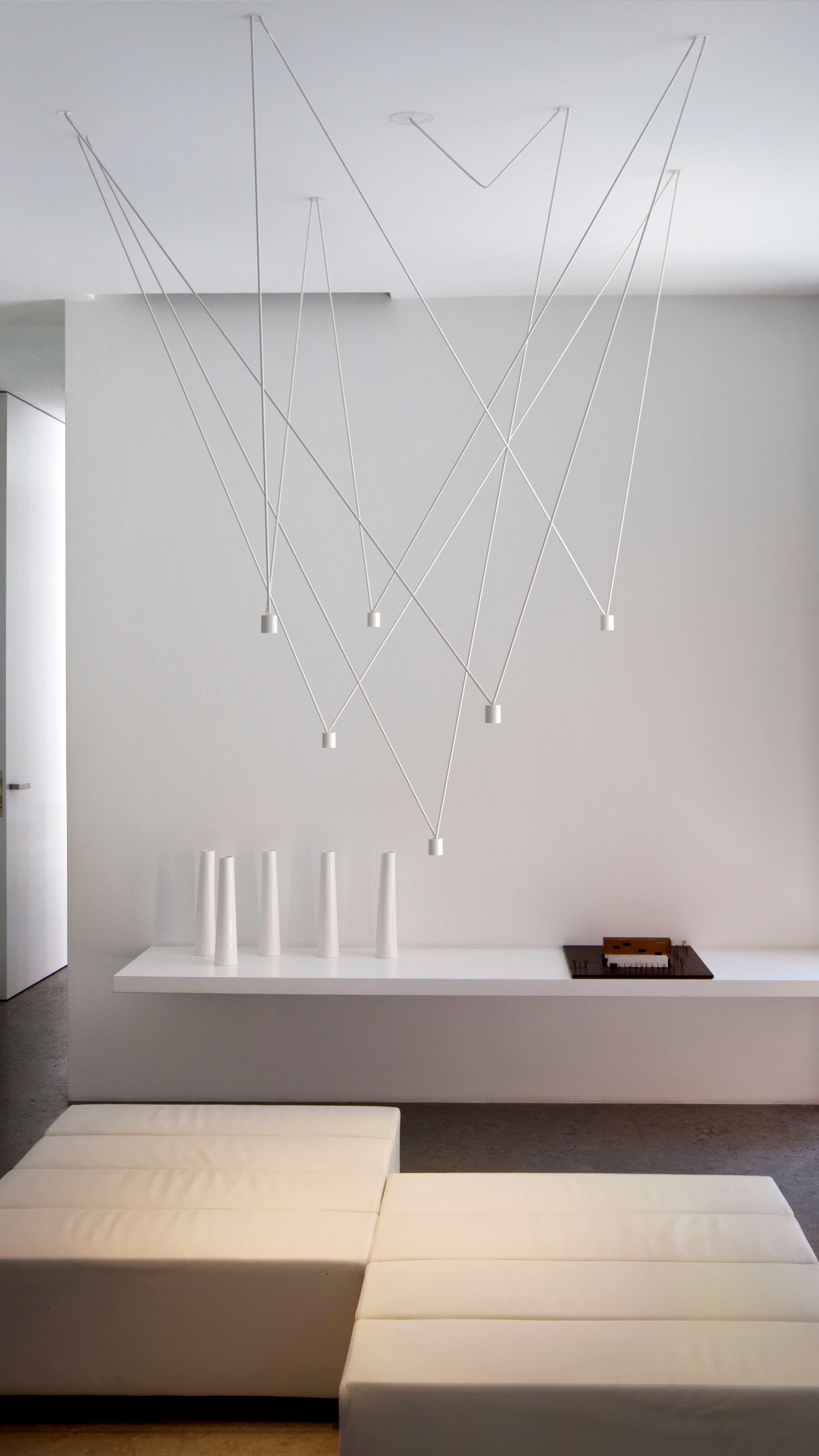 Match is a collection of suspended luminaires composed of slender rods in a matt white or matt graphite finish, each tipped with LED light points.